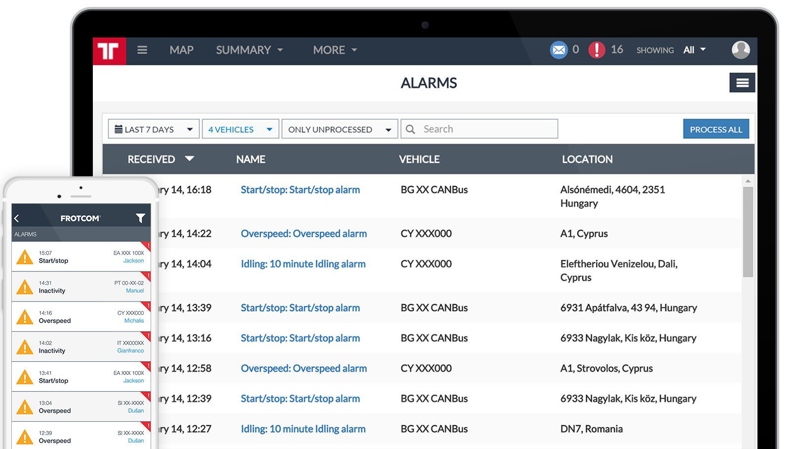 Frotcom предлага повече от 30 различни вида аларми, включително за Превишена скорост, Температура на двигателя, Отворена врата, Ниво на горивото, Маршрути, Излизане от зона и много други.