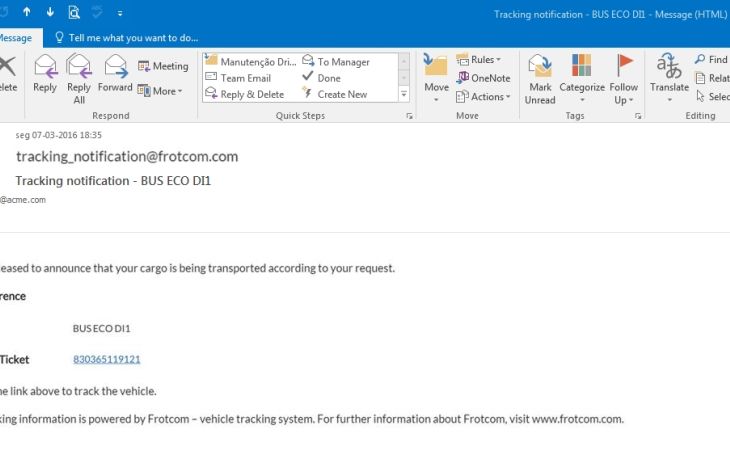 Wann immer Sie ein Tracking-Ticket erstellen - sehr einfach in Frotcom zu erstellen - können Sie den Kunden auswählen, der das Tracking-Ticket per E-Mail erhält. Danach kann der Kunde den Verbleib seiner Fracht in Echtzeit sehen, solange bis der Auftrag erfüllt ist oder das Tracking-Ticket ausläuft.