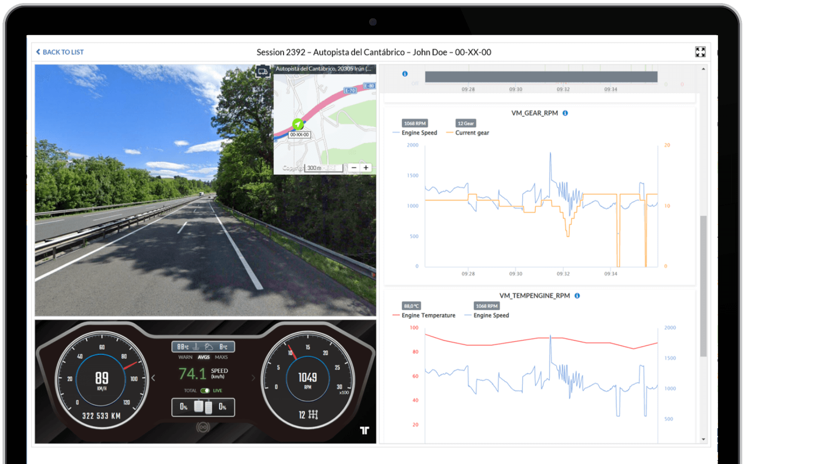 - Several tools available to analyze each driving session: map, street view, dash with various indicators, and multiple graphs.